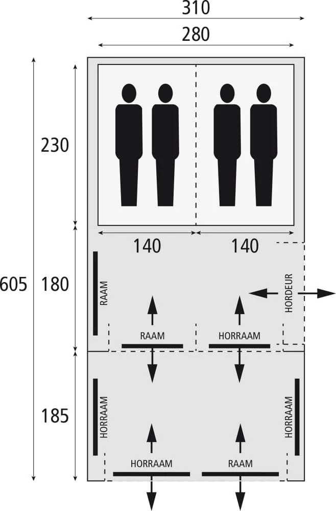 Een slaapcabine van 280 cm breed biedt ruimte aan 4 personen, mits zij slapen op slaapmatten die niet breder zijn dan 70 cm. Gezinnen van 3 personen zijn extra in het voordeel bij deze tent, omdat een deel van de slaapcabine dan gebruikt kan worden om bagage op te bergen. De slaapcabine is lekker donker, je kunt hier eventueel de tussenwand wegritsen.