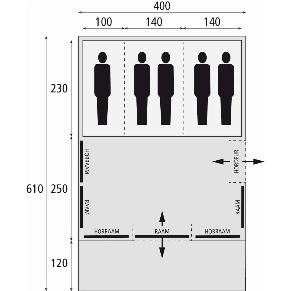 Verder beschikt deze veelzijdige tent nog over een volledige horrengaasdeur en er zit horrengaas aan de achterzijde van de binnentent. Aan weerzijden van de tent zit een handig stroomkabel doorvoersysteem die voorzien is van ritssluitingen.