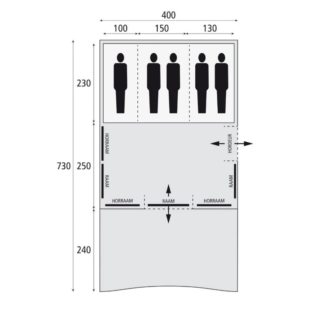 Verder beschikt deze veelzijdige tunneltent nog over een volledige horrengaasdeur en er zit horrengaas aan de achterzijde van de binnentent. Aan weerzijden van de tent zit een handig stroomkabel doorvoersysteem die voorzien is van ritssluitingen.