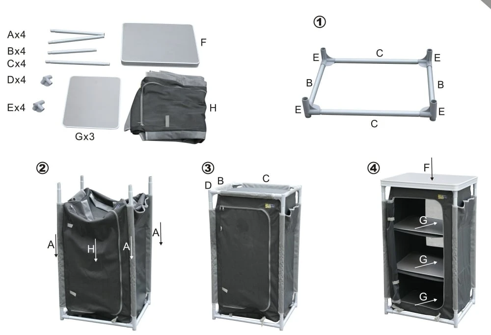 Door middel van verstelbare pootjes onder de kast kun je hem makkelijk recht zetten op een ongelijke ondergrond. Ook is de Nice campingkast voorzien van extra vakjes aan de zijkant om even snel de kleine spulletjes in weg te bergen. De campingkast wordt geleverd met een handige draagtas.