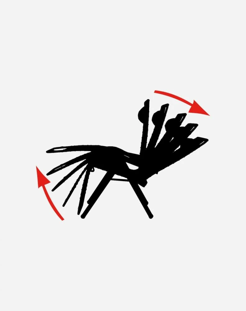 Door met je rug tegen de rugleuning aan te duwen, de voeten op de onderste stang te zetten en dan de hakken omhoog te duwen. Wanneer je de juiste stand hebt gevonden klem je het frame vast door de vleugeltjes die onder de armleuning zitten naar binnen of naar buiten te vouwen.